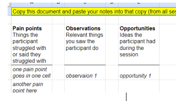 - Facilitate group synthesis session using team members' notes --> Pull out themes, Prioritize pain points discovered