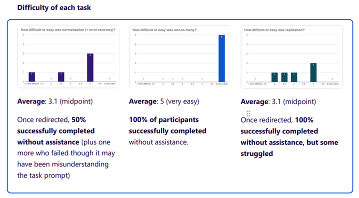Qualitative usability testing | Qualitative usability testing is great for identifying usability issues and needs ~5 users, which was doable within a single week. |